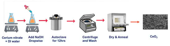We created nanoparticles using hydrothermal synthesis, which involves dissolving enough cerium (III) nitrate hexahydrate (Ce (NO3)3·6H2O) in distilled water for six hours to create a homogenous solution. At the same time, 1.0 M of NaOH was completely dissolved in distilled water in a separate beaker. To create a fully homogeneous solution, NaOH was then gradually added dropwise to the initial solution at room temperature until the pH reached 10–11. The entire mixture was then put into a 100 mL Teflon-lined autoclave and heated to 170 °C for 6 h. A small amount of pale-yellow precipitate was produced after the autoclave was moved outside and allowed to cool at room temperature; this precipitate was then maintained in a hot oven for drying. Then, annealing at 550 °C and allowing the powder to cool at ambient temperature were both carried out. As a result, powdered CeO2 was created, and the chemical Equations (1) and (2) below reflect this. Additionally, a systematic diagram was given to explain the synthesis process shown in Figure 1.