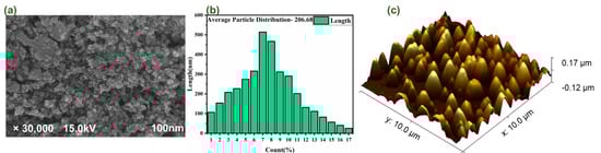 (a) shows the FE-SEM micrograph in the nanometer range; (b) shows the particle size distribution graph in nm; (c) shows the AFM micrograph in 3D view.
