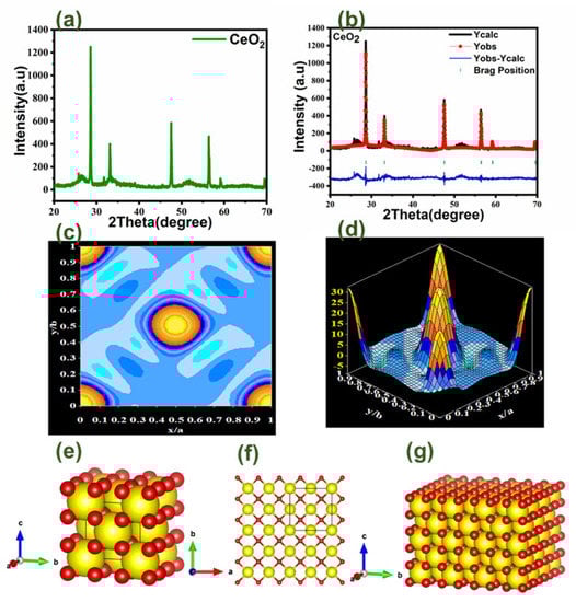 (a) shows the XRD graph of CeO2; (b) shows the Rietveld refinement graph; (c) shows the electron density mapping in 2D counter form; (d) shows electron density mapping in 3D form; (e) shows the crystal structure of CeO2 in the single unit cell; (f) shows the crystal structure of CeO2 single layer; (g) shows the crystal structure in a multilayer structure.