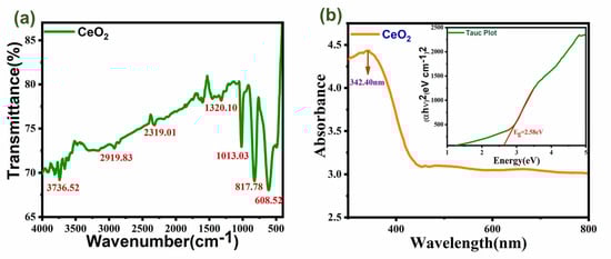 (a) shows the FTIR graph; (b) shows the UV–visible graph of CeO2 with a band gap plot.