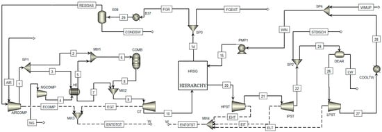 The Turakurgan TPP consists of two of the same (450 MW outputs) blocks with Mitsubishi Hitachi M701F Series gas turbines (GT). The simulation of one block of the 450 MW gas and steam turbine was developed and validated using the commercial software Aspen Plus® (AspenTech, Bedford, MA, USA) (See Figure 1). In the power generation process, 664.5 kg/s of ambient air with a pressure of 0.944 bar was compressed up to 18 bar and was divided into two directions—one for the combustion reactor after mixing with 16.11 kg/s (lower calorific value (LCV)—46.750 kJ/kg) of natural gas, while another one was used to cool down the hot flue gas coming out of the combustion chamber right after the heating of the natural gas by the heat exchanger. Due to the metallurgical limitation on the inlet temperature of up to 1300 °C of the F-type GTs, an extra amount of air of 34 kg/s was used to keep the GT inlet temperature at a permissible level (the exact amount of cooling air is not provided in the project report, so it is calculated by Aspen Plus in response to the GT inlet temperature limitations). The GT outlet hot gas at 1 bar and 596 °C was fed to the heat recovery steam generator (HRSG) where the heat from the hot flue gas was absorbed by the heat exchangers, generating even more power with three steam streams in high pressure at 127 bar, intermediate pressure at 27.5 bar, and low-pressure steam turbines (ST) at 4.5 bar. The flue gas exits the HRSG (14) at 104 °C and 0.981 bar.