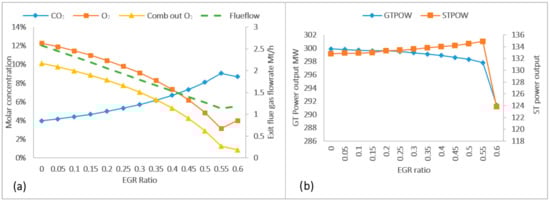 It can be observed from Figure 2a that, at first glance, nearly all variables are reaching their optimal value when the EGR ratio is 0.55. After this point, the amount of ambient air cannot be reduced, even though the amount of recirculated flue gas increases due to O2 deficiency in the combustor and a significant quantity of carbon monoxide (CO) generation. However, for the combustion reaction to occur stable and for the conversion of all hydrocarbons completely, O2 content in the combustor outlet flue gas should be between 3 and 4 mol%. In terms of the EGR effects on the GT and ST power outputs, the result shows that as the EGR ratio is increased, the GT power output is decreasing, while the ST power output generates more power (see Figure 2b). The GT power generation efficiency decrease can be explained by the fact that the flowrate of the air and gas mixture coming into the compressor is slightly higher than without the EGR case so as to keep the GT inlet temperature at 179–180 °C in each EGR ratio test, resulting in the compressor’s higher power consumption. For instance, the flowrate of the compressor inlet mixture gas is higher by approximately 1.15 kg/s at the 0.05 EGR ratio and by 10.1 kg/s at the 0.5 EGR ratio than the value without EGR. In the case of a positive effect of EGR on steam turbines, as the EGR ratio increases, the GT outlet temperature also increases, resulting in more steam generation and as the power output increases. The steam cycle power output at 0.45 of the EGR ratio generates 1.05% more electricity than that without EGR.