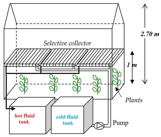In order to optimize the energetic balance of agricultural greenhouses, several works have been carried out whose principle is to limit the thermal exchanges between the internal climate of the greenhouse and the external environment. Most of the solutions propose to insert a screen between the greenhouse wall and the crop. There are two types of screens: static screens, which are generally placed at night to limit losses due to infrared radiation emitted by the ground, and dynamic screens based on a fluid circulating between two walls (double coverage) or inside a collector placed in the greenhouse. This second type of screen has a double role: to cool the greenhouse during the day by conveying the excess energy reaching the plant and to heat it during the night by restoring the energy stored during the day. With this objective in mind, a heating and cooling system for an agricultural greenhouse has been developed by the Solar Energy Laboratory of the Faculty of Sciences of Rabat (Figure 4). This system is centered on a polyethylene solar collector with methylene blue circulation acting as a heat transfer and selective fluid: Introduced into the greenhouse, it transmits the part of the solar spectrum useful for photosynthesis and absorbs the rest.