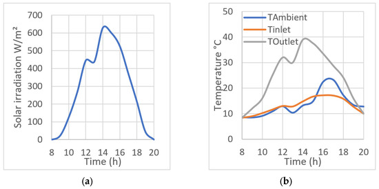 (a) Collector inlet and outlet temperature variation. (b) Global solar radiation variation.