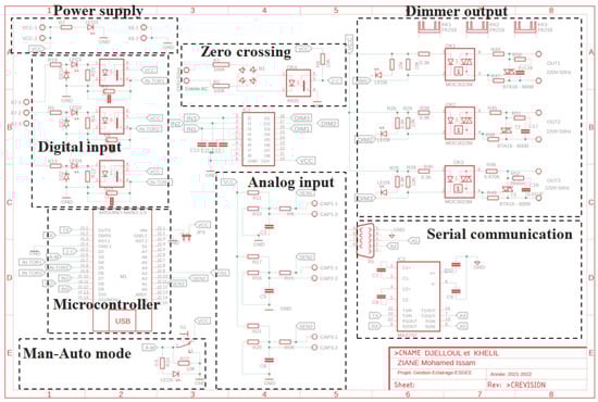 The first part is carried out in two modes, manual and controlled with a graphical interface. The second is processed by a microcontroller, an Aduino nano in our case. As for the third part, it controls three poles via Optotriacs + Triac for full and half lighting. In order to make our light control system, different components were used and a user interface was created. For the realization of our electronic card, and in order to prototype our electronic circuit in a real Printed Circuit Board (PCB), we used the EAGLE PCB software [