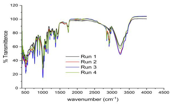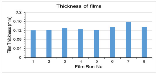 The Fourier transform infrared spectroscopy (FTIR) of the four film samples is shown in Figure 4. Figure 4 clearly shows that all the films are of the same nature with only a slight difference in the intensity of transmittance. Figure 4 also shows that no chemical transformations happened during the film-forming process and solvent evaporation.