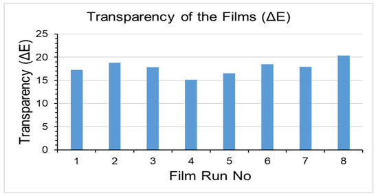Figure 2 shows that, all the films were transparent enough when compared with a transparent plastic sheet. The transparency parameter ΔE of the films was observed to be in the range of 15 ± 2–20 ± 2. ΔE values of less than 50 are usually referred to as transparent films. Therefore, the beeswax, castor oil, and clove oil-integrated pectin films developed in the present work are transparent.