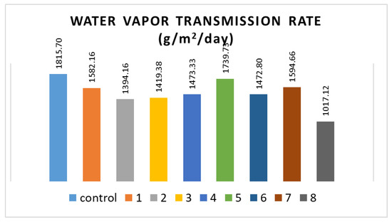 The water vapor transmission rate was analyzed due to the fact that less moisture from the food should be transmitted out so that desirable moisture is present in the food to keep up the freshness of the food. It is usually measured in g/m2/day. The analysis was performed by using the facility at Northern India Textile Research Association, Ghaziabad, India, and Sree Chitra Tirunal Institute For Medical Sciences & Technology, Thiruvananthapuram, India. It was performed according to the ASTM standard ASTM E96/E96M-05 (water method), maintained at a temperature of 32 ± 2 °C and relative humidity of 50 ± 2%, with air velocity set between 0.02 and 0.3 m/s.