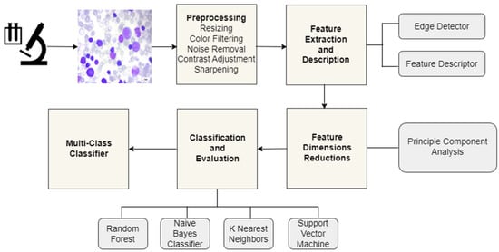 The suggested architecture involves a few steps from an input blood sample image, which are applied to the final results. The input photos are first gathered. These photographs often come in a range of sizes and resolutions. They are useful for every type of experiment and analysis due to their homogeneous size. For the distinct region of interest, these photos are subsequently shrunk and color-filtered. It can be difficult to find attributes that are appropriate for the goal-mining algorithm. The Canny edge detector and HOG feature descriptor are used to accomplish feature identification and describe the images after a rigorous inspection of the images, taking our purpose into account. Principle component analysis is used to decrease the feature dimensions. Random forest, naive Bayes classifier, support vector machine, and logistic regression are used for classification. Figure 1 describes each step of the proposed methodology. In the preprocessing phase, various operations, such as resizing, noise removal, and contrast adjustment, are carried out, and then features are extracted. After that, dimension reduction is applied for PCA, and finally classification is carrried out using classifiers. At the final stage, a multiclass classifier is used for classification.