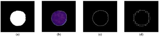 These characteristics can be extracted from the objects in the image. Because blast cells (ROI) carry a multitude of information, including information about their cytoplasm and nucleus, the feature-extraction stage is critical for identifying the kind of acute leukemia. The retrieved photos show rounded cells. For convenience, during feature detection, an intelligent edge detection algorithm is applied to each image. A Gaussian filter is used to smooth the image and get rid of noise. Next, we calculate the intensity variations within the image. The two-fold threshold is then applied to locate possible image boundaries. Hysteresis is then used to follow the contours of the image. To finish the edge identification process, weak edges that are not related to strong edges are suppressed. Figure 3 describes the step-by-step effect on the sample images. Figure 3a shows a sample image after the processing and color filtering; Figure 3b shows the image after performing the operation. Figure 3c shows the effect after the feature-extraction process and Figure 3d shows the effect after the feature-description process.