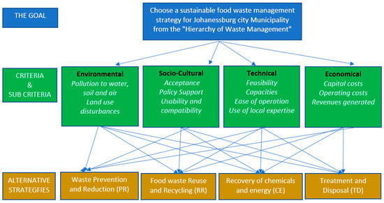 The city of Johannesburg generates approximately 12 kg of food waste per person per year and this is predominantly restaurant or kitchen food waste []. With an estimated population of five and a half million people, this means the city accrues an unimaginable amount of food waste []. Some of this food loss is avoidable through implementation of good practices while the other portion cannot be avoided []. Food waste in the city of Johannesburg was previously managed through treatment and disposal in four landfills of which two of these four are closed after being filled to their maximum capacity []. The remaining two active landfills currently being used for waste disposal are fast running out of space as waste generation is increasing every day. The Municipality of Johannesburg city has limited land space to develop new landfills and such an exercise would also require huge sums of capital outlay. Globally, managing organic waste through landfilling has lost popularity as new and more sustainable strategies have now advanced to the commercial scale. Some of these strategies include biomethanation, composting and reuse of waste in resource recovery. Practitioners in waste management rank strategies on “The Hierarchy of Waste Management” to reflect the most preferred strategy based on addressing the circularity of the economy. The strategies can be grouped as prevention and reduction, reuse and recycle, recover, and finally treat and dispose, in order of most preferred to least preferred []. To select the appropriate waste management strategy or technology for each situation depends on several factors which are derived from the customer’s main goal in managing the waste. Several methods are available in the literature for guiding decision making where several criteria, alternatives and factors are involved. Among these methods and techniques is the Analytic Hierarchy Process (AHP) technique which falls under the Multi-Criteria Decision-Making (MCDM) method [,]. Although this technique is widely applied in various industries, there is no literature on this technique’s use in selecting the best food waste valorisation route specifically for JHB city. This study seeks to choose the most sustainable food waste management strategy for JHB city’s municipality from those stated in the waste management hierarchy.