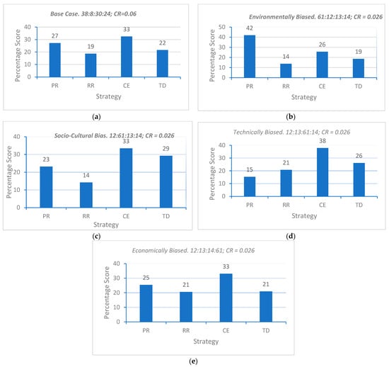 AHP results for different scenarios: (a) Base (b) environmentally biased (c) socio-culturally biased (d) technically biased and (e) economically biased. (Numbers after each title indicate % weight of each criterion in the case mentioned. The order of weights is Environment; Socio-Cultural; Technical; Economical, then CR is the consistency ratio).