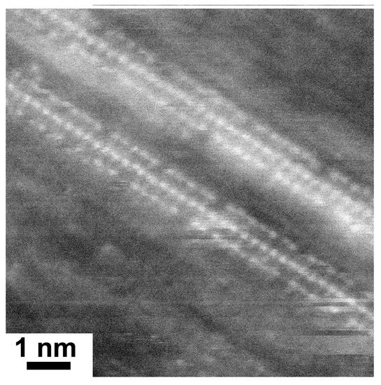 Figure 2 shows the HRTEM image of lead iodide-filled SWCNTs. Two filled SWCNTs are visible in the image. The atoms of salts are clearly recognized inside SWCNTs. They are visible as white dots. Three columns of atoms are observed within the walls of carbon nanotubes. The distances between three columns of atoms are equal.