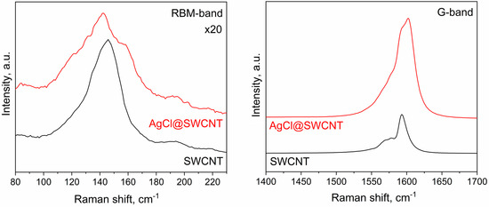 - Kharlamova, M.V.; Kramberger, C.; Mittelberger, A.; Yanagi, K.; Pichler, T.; Eder, D. Silver Chloride Encapsulation-Induced Modifications of Raman Modes of Metallicity-Sorted Semiconducting Single-Walled Carbon Nanotubes. J. Spectrosc. 2018, 2018, 5987428. [Google Scholar] [CrossRef]