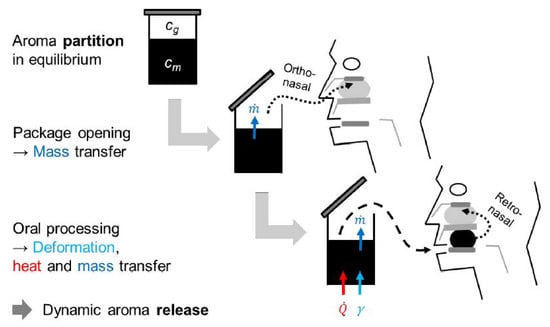 Extensive research has been conducted on the topic of aroma release to explain the perception formed in the brain. Aroma perception is a complex phenomenon, as it depends on physiological parameters showing large inter-individual differences (e.g., saliva, breathing) [], and it shows cross-modalities to our other sensory inputs, i.e., texture and taste. However, from the food perspective aroma, the release mainly depends on the interactions between the aroma compound and the ingredients of the food (fat, carbohydrates, proteins, etc.) in a defined food environment (pH, temperature). The strength of these interactions can be quantified by the partition coefficient , defined as the quotient between the flavor concentration in the food, and the concentration in the headspace above the food []. The value is determined in equilibrium; thus, it describes the thermodynamic end state. However, it also determines the kinetics of aroma release, as the release rate is higher for aroma compounds showing weak interactions with the matrix.