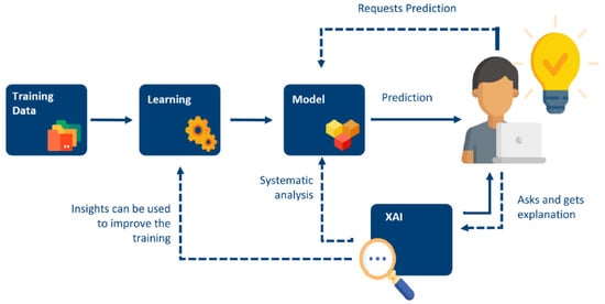 Process of machine learning-based prediction with an additional XAI component to explain the results to the users.