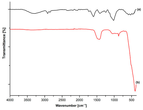 Figure 1 shows the ATR-FTIR spectra for both the Echinacea extract (a) and the CuO NPs obtained from the extract (b) to establish the possible phytochemical compounds responsible for the bioreduction, capping, and stabilization of the CuO. The characteristic spectrum of the extract (Figure 1a) indicates the presence of metabolites (e.g., flavonoids, alkaloids, terpenes, etc.), which are responsible for the process of reduction and stabilization of the nanoparticles. Table 1 shows the possible assignments of the spectral bands both for the extract and for the oxide nanoparticles obtained. The FTIR spectrum of the CuO sample (Figure 1b) confirms the occurrence of the characteristic peak at 402 cm−1, which can be attributed to the vibrations of Cu-O, but also the presence of the functional groups characteristic of the biomolecules present in the extract, which indicate the presence of C-O stretching alcohols, carboxylic acids, esters, and ethers. In Figure 1b, a peak of high intensity centered at around 402 cm−1 can be observed, which can be associated with the vibration mode of the Cu-O bonds, as well as peaks of reduced intensity that are shifted towards higher wave numbers as compared to the extract due to the anchoring of the molecules from the extract on the surface of the oxide nanoparticles.