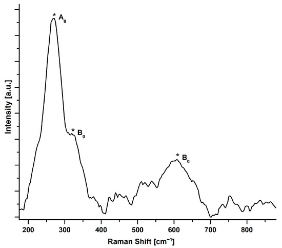 The Raman spectrum of the CuO nanoparticles is presented in Figure 2, having been obtained in the range 100–1000 cm−1 at room temperature. The recorded spectrum shows the presence of three scattering bands, with peaks located at 272, 333, and 610 cm−1. The peak centered at 272 cm−1 is assigned to the Ag mode, and the other two peaks at 333 and 610 cm−1 are assigned to the Bg modes. No active modes related to other phases, or any impurities, were detected, which indicates the formation of monoclinic phase CuO.