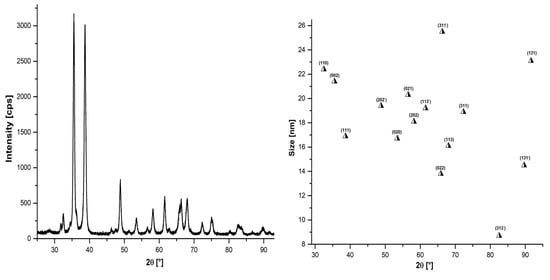 For the biosynthesis of CuO nanoparticles, we used the natural extract of Echinacea leaves [Echinacea purples], copper nitrate [Cu(NO3)2 3H2O], sodium hydroxide [NaOH], and deionized water [H2O]. All chemicals were purchased from Sigma-Aldrich (Munchen, Germany) without any further purification, and the required solutions were prepared in deionized water. The dried Echinacea leaves were washed to remove dust particles, after which a quantity of 10 g was added to 100 mL of deionized water (DIW) and heated at 100 °C for 2 h. The mixture was then cooled to room temperature, and the extract was filtered using Whatman filter paper No: 1 (Merck, Darmstadt, Germany). To synthesize the CuO NPs, Echinacea extract was added dropwise over the aqueous solution of Cu(NO3)2 3H2O [0.1M] under continuous stirring using a magnetic stirrer at a temperature of ~80 °C for 2 h, after which the solution became dark green. The ratio between the main components was Cu(NO3)2: Echinacea extract = 2:1. The NaOH solution [0.1 M] was added drop by drop to the obtained solution until the pH = 12. This reaction was then left for 3 h, under continuous stirring at a temperature of ~80 °C. After the reaction had finished and a brown precipitate formed, the solution was left to rest for 24 h. Then, the obtained precipitate was centrifuged at 9000 rpm for 20 min and washed three times with DIW. The powder was dried at 100 °C for 4 h, followed by thermal treatment at 450 °C for 3 h, with an oven heating speed of 5 °C/min, in order to obtain a brownish-black powder.