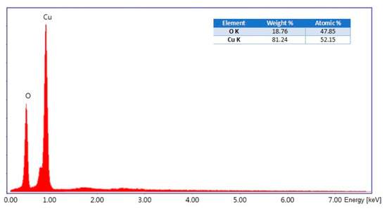 The elemental composition of the CuO sample is presented in Figure 5. In the EDX spectrum of the analyzed sample, only the peaks attributed to Cu and O elements are present, confirming the purity of the synthesized material. The weight and atomic compositions of the main elements (Cu and O) are presented in the inset table of the EDX spectrum.