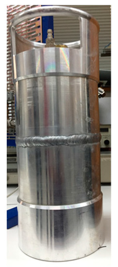 To enable the operation of the FC, a hydrogen storage device is necessary. In the present case, this issue has been solved through a metal-hydride bottle model HBond-1500 L from the manufacturer Labtech [16]. It has a charging pressure of 15 bar and a storage capacity of 1500 N liters. The appearance of this storage bottle is shown in Figure 4.