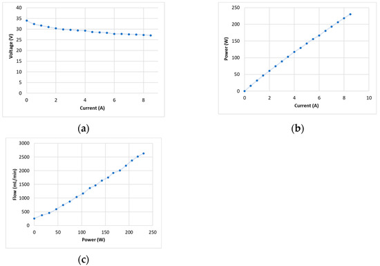 Firstly, the polarization curve corresponding to the relationship between the voltage and the current produced by the FC is given in Figure 6a. Regarding the power generated by the FC with respect to the delivered current, Figure 6b shows the experimental data. Figure 6c depicts the curve obtained for the relationship between the hydrogen fed to the FC and the generated power.