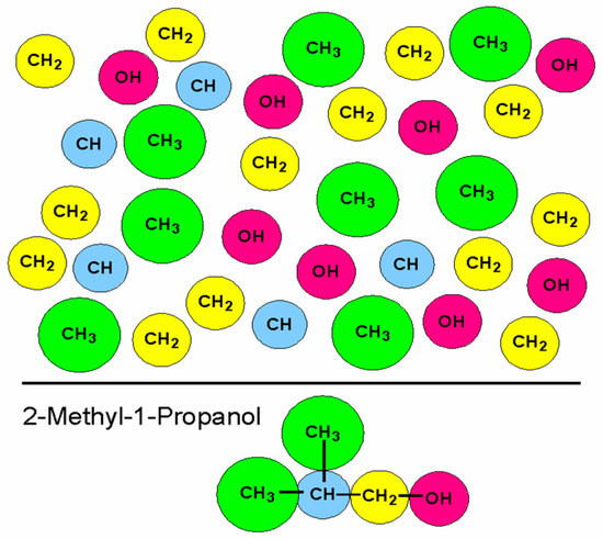 The group contribution (GC) approach is an old [1] approach and has been, over the course of time, developed for many molecular properties. The basic idea is illustrated in the scheme below Figure 1 where the molecule is broken into building blocks, the groups, and we also see the groups that constitute 2-methyl-1-propanol. The GC approach inherently assumes that the groups behave independently, and the value of a molecular property is calculated from the sum of the individual properties of the groups by: