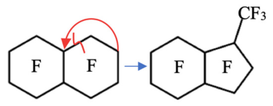 Perfluoro(7-methylbicyclo[4.3.0]nonane) (MBCN) is one of the identified impurities of a closely boiling industrial mixture of products of the configurational and structural isomeric reaction of the electrochemical fluorination of decalin and naphthalene [9]. During the target component production, PFD, there is a partial destruction of the carbon chain followed by a partial radical cycle-closing reaction to form MBCN (Figure 1).