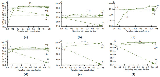 MBCN content (X, mass %) in samples versus sampling ratio according to Table 1: (a) experiment no. 1; (b) experiment no. 2; (c) experiment no. 3; (d) experiment no. 4; (e) experiment no. 5; (f) experiment no. 6. F—feed; W—bottom; ∑D—total distillate; Fr—fraction composition.