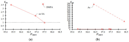 Ac is more efficient not only when compared to DMFA (Figure 2f) but also when separating a mixture with a lower (0.964 in mass fraction) concentration of the target component in the feed solution (Figure 2e). Thus, adding Ac makes it possible to obtain an MBCN fraction with a purity higher than 0.998 in mass fraction, and the degree of recovery is quite high, ≥0.85 in mass fraction, in just one process cycle. At = 0.964 ÷ 0.984 in mass fraction, the separation process intensifies by an order of magnitude: Ksep ≈ 1 → 273.46 ÷ 87.55 (Figure 3); ≈ 1 → 0.15 ÷ 0.11; and ≈ 1 → 42.26 ÷ 9.96 (Figure 4).