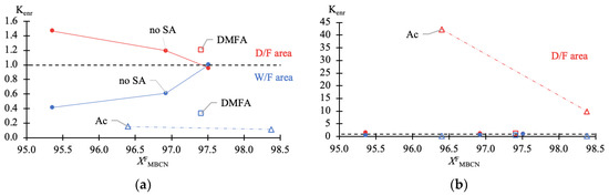 Ratio of enrichment (Kenr) of MBCN versus target component content in feed fraction (Table 1 data). (a) zoomed-in W/F area (—blue); (b) diminishable D/F area (—red).