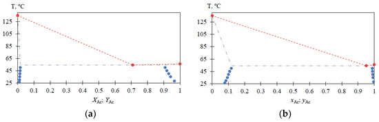 For the MBCN-Ac system, the liquid–liquid phase equilibrium data are also obtained in the temperature range from 25 to 50 °C (Table 2) and heteroazeotrope characteristics are determined (Table 3). The solubilities of Ac in MBCN (xAc = 0.0778 → 0.1183 mole fraction) and MBCN in Ac (xAc = 0.9956 → 0.9876 mole fraction) increase with increasing temperature from 25 to 50 °C; the heteroazeotrope composition at atmospheric pressure is greatly shifted toward Ac. The presented data (Figure 5) allow for estimating the loss of Ac in the distillate flow and calculating the amount of heteroazeotrope-forming agent required for the process, as well as being essential for the process flowsheet design.