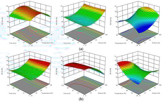 Equation (1) shows that the FR yield was highly influenced by the ethanol percentage, as this factor induced marked linear and quadratic effects and interacted with time. The 3D graphs in Figure 1a show that the higher yield was promoted by higher ethanol percentages. In turn, temperature mainly induced a negative quadratic effect. Thus, the extraction of C. oblonga fruit peel powder for 69 min with 100% ethanol at 61 °C led to the highest FR yield of 64 ± 2% (w/w).