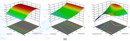 Response surface plots illustrating the effects of the three factors on (a) yield, (b) dietary fiber (DF) content, and (c) lightness of the FR samples obtained from C. oblonga fruit peel by dynamic maceration. In each representation, the unplotted factor was kept constant at its optimum value.