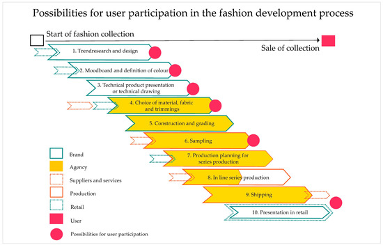 Mass customisation (MC) and open innovation (OI) are innovative strategies that involve customers or external experts in product development and enable interactive value creation. While mass customisation aims to produce a single personalised product, open innovation aims to openly develop a new product for a large group of customers [12]. MC and OI receive little attention from the major players in the garment industry. Customers remain predominantly in the passive role of the recipients [13]. Some companies are testing mass customisation as a complementary concept to their traditional product development [14]. On the other hand, open innovation approaches are not yet anchored in mass production in the garment industry. Based on this, Figure 1 shows the process steps in which user participation is theoretically possible within the fashion development of agency businesses.