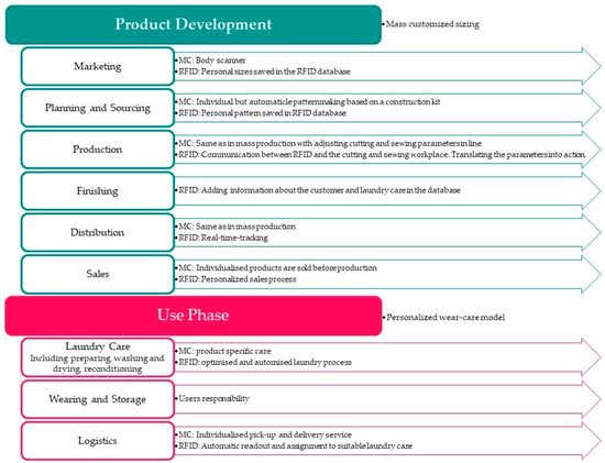 Mass-customised products reflect individual needs and, at the same time, achieve a price that is close to that of conventional mass-produced products [22]. This is possible through industrial production in manufacturing with individualised sub-processes. The customer can choose from a limited range of solutions. With mass customisation, fitting the user’s needs is improved. In our scenario, the solution space takes place between steps four and five of product development (see Figure 1), The customer is measured with a body scanner to produce the right fit for their individual body measurements. The solution space only facilitates fitting without any design aspects. Communication with RFID systems can help to implement mass customisation in the production line. Figure 2 shows the objective of mass customisation (MC) and the role of the RFID system (RFID) in each step of the product development and the use phase. From the moment the mass-customised outdoor jacket is purchased, the consumer’s use phase begins, consisting of wearing, preparing, washing, drying, reconditioning, and storing steps.