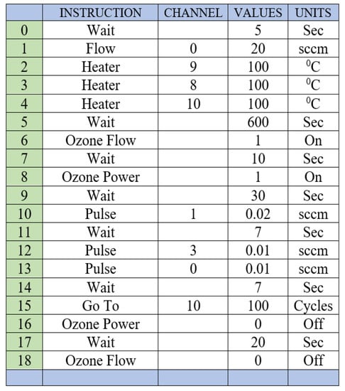 The ALD process is briefly introduced here to understand the role of factors and responses. Process input parameters are termed factors, and the performance characteristics are termed responses. The accompanying schematic of ALD in Figure 1 is for the Vecco Savannah thermal ALD system. It has four cannisters for ozone (O3), trimethyl aluminum (TMA), cobalt (Co), and water (H2O). Strem Chemicals, Air Liquide, or Sigma Aldrich are the vendors who provided ALD precursors with suitable vapor pressure. It is imperative to know the vapor pressure of the precursor at various temperatures or else the cannisters are heated to increase vapor pressure. Volatility due to the vapor pressure of the precursors is critical for chemisorption [,]. The Swagelok cylinders are connected to a manifold that provides an independent path for each precursor to the ALD chamber. Solenoid valves control the amount of precursor pulse based on the valve timing. The 6″ or 8″ silicon (100) wafer with a layer of 300 nm SiO2 was procured from University Wafers. Before the deposition of Al2O3, the substrate was cleaned with IPA, rinsed with DI water, and dried with N2. Figure 2 demonstrates the ALD recipe that details instructions and the channel with units for process parameters.