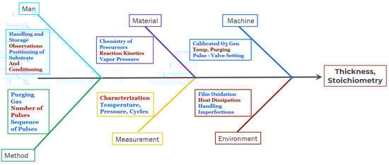 For the determination of parameters and responses to be studied during experimentation by designing, it is very important to list and identify several parameters and responses (factors) associated with the ALD process in an Ishikawa diagram, as shown in Figure 3. The steps of the recipe in Figure 2 are self-explanatory; however, the deposition characteristics are modified by the order and time of the precursor supply, temperature, purging time, and number of cycles. The Vecco Savannah ALD system maintains a constant vacuum pressure of 0.5 Torr. From the practical perspective, the effectiveness of the DoE model depends on the sensitivity analysis of the process input factors. The sensitivity analysis of the input parameters means whether the limits chosen to vary cause a significant impact on the response characteristics of interest. Considering the linear relationship between the number of pulses and the thickness of the deposition, during this exercise, the number of cycles was kept constant. DoE is effective only if carefully designed with significant engineering insight and the experience of the parameters. Once effectively designed, there are numerous major benefits of DoE from a manufacturing perspective.