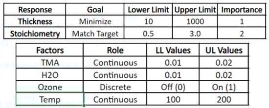 While new ALD variants and material chemistries are developed, consistency and reproducibility need to be addressed [,]. The JMP tool is an industry-standard for DoE. The “Custom Design” utility in the JMP-DoE menu equips users with intuitive DoE model development. First, the response characteristics are to be defined. The definition of response characteristics includes the name as the identifier and the targeted response to minimize, maximize, or match the target. For example, the Al2O3 layer thickness is to be minimized optimally without compromising the refractive index (IR) or density. If the IR or density are chosen as response characteristics, it is the property of the material so that it has to be matched as close to the expected value as possible. For the DoE of Al2O3, the stoichiometric response is to be matched in the ratio of 2:3. Once the response characteristics are amicably defined, the input parameters identified as factors are defined by naming the identifier and lower (−1) and upper (+1) limits of the parameter. The factors identified for v Al2O3 synthesis are the TMA pulse of 0.01 to 0.02 s, H2O pulse of 0.01 to 0.02 s, ozone pulse on/off, and 100 to 200 °C temperature. When ON, the ozone pulse is 0.01 s. Out of the several types of model design available in JMP, response surface methodology (RSM) is chosen. Based on the number and types of responses and factors, the DoE table is derived (Figure 4).