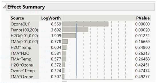 The effects summary table of Figure 5 conclusively identifies that ozone is the most dominant factor for the chosen responses. Temperature is the second most influential factor. Subsequently, all other individual factors are not dominant, but the interaction of the factors is statistically significant. One important question arises here: in what manner are the dominant factors influencing the response? This requires an insight into the setting up of the DoE. As there are two response parameters chosen for analysis, these factors can be dominant with any one or both. Furthermore, the response characteristics for thickness were to minimize and for stoichiometry were “match target”; thus, the effects table points to this desirability defined during the construction of DoE.