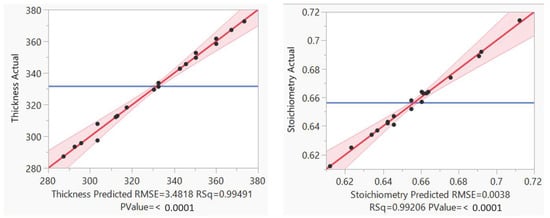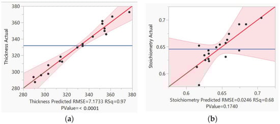 Plots for actual vs. predicted values of (a) thickness and (b) stoichiometry.