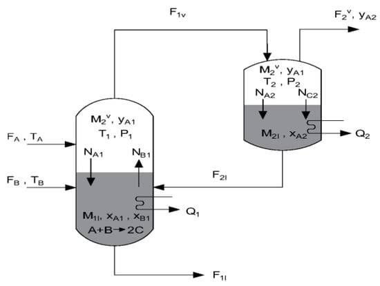 B mole fractions in the liquid phase. For the sake of simplicity, heat capacity, density, and molar heat of vaporisation are considered to be constant and equal for all species. The liquid and vapour phases are suitable combinations. The liquid stream from the reactor is withdrawn at a constant flow rate