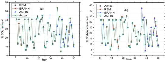 RSM, ANN, and ANFIS synthetic data compared to the actual values of (a) SO2 capture and (b) sorbent conversion.