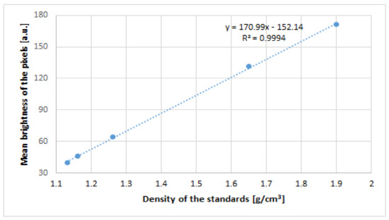 The average brightness of the pixels was measured with ImageJ software (ImageJ 1.53a; National Institutes of Health, Madison, WI, USA). A curve of dependence between the brightness and density of the known area from the phantom was drawn (Figure 2).