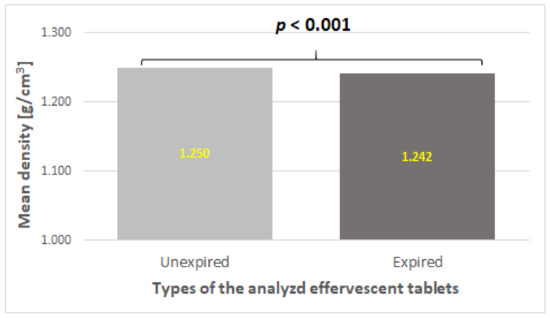 The density of the inner structure differed significantly between the two types of studied effervescent tablets with vitamin C (p < 0.001). Tablets within the expiration date had a higher mean density than tablets outside the expiration date (Figure 3). This may indicate that unexpired effervescent tablets containing vitamin C showed better homogeneity than expired ones.