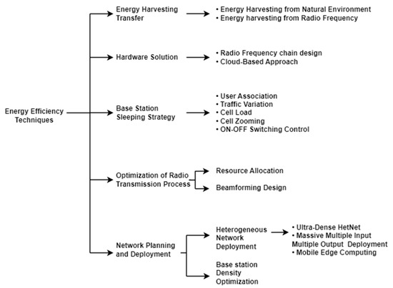 Several energy-saving techniques use traffic load analysis to achieve the optimal QoS and improve energy efficiency in BSs. These techniques include user association, traffic variation, cell load, cell zooming, and on–off switching control, as shown in Figure 1. Additionally, other techniques from Figure 1 can also impact the energy efficiency of the base station.