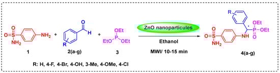 A series of new Ξ±-sulfamidophosphonate derivatives has been successfully synthesized with remarkable efficiency via a one-pot, three-component KabachnikβFieldβs reaction. The reaction involved the use of sulfanilamide (1) with various aromatic aldehydes (2aβg) and trialkyl phosphite (3) under microwave irradiation catalyzed by catalytic quantities of (ZnO-NPs) in ethanol. The reaction was completed with excellent yields (Scheme 1).