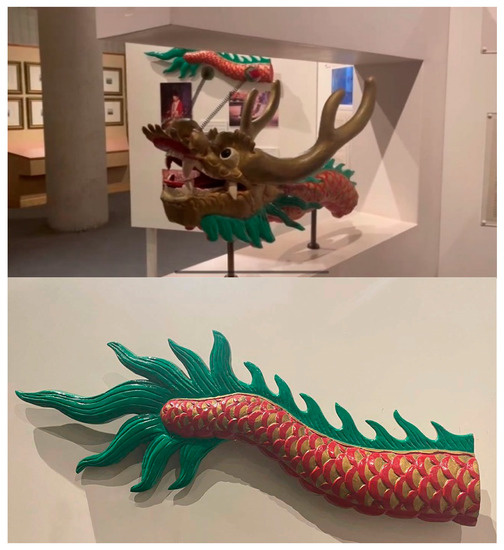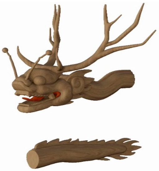 In 2022, Wei-Ming Guan, the vice president of the Macau Fresh Fish Traders Association was interviewed. He said that the Drunken Dagon Dance in Macau is different from the traditional dragon dance. There are only two parts, the dragon head and the dragon tail (Figure 1). The dragon head is generally 3 feet long, and the dragon tail is about 2 feet long. Both parts are made of teak and painted with gold or silver for color matching. Dragon horns are made of antlers from Taiwan or China. The overall shape of the drunken dragon is rounded and streamlined, and the scales are drawn on the surface.