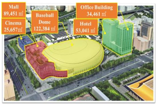 The Taipei Dome Complex, the research object of this study, is located in Xinyi District, Taipei City, Taiwan. It is a composite park. The main body is a multi-functional dome, and the other also has constructions such as a shopping mall, restaurant, cinema, and office buildings (Figure 1). The crowd capability of the dome is 59,833 [5], which is approximately double that of the Taipei Arena (currently the largest arena in Taiwan). If an incident like the Manchester Arena terrorist attack occurs in the Taipei Dome Complex, the consequences will be disastrous. Therefore, this study is being carried out to determine the risk factors for disasters and safety events for the Taipei Dome Complex and provides security recommendations for large events.