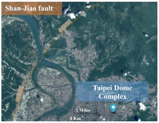 The TAIPEI Dome Complex is located in the Xinyi District, Taipei City, Taiwan. We used the disaster-causing analysis template proposed by the Federal Emergency Management Agency (FEMA) to analyze potential disasters in the complex, focusing on fire, flood, earthquake, and terrorist attacks, as shown in Table 1. In terms of earthquakes, Taiwan is in the seismically active area of the “Circum-Pacific seismic belt” and the Shanjiao fault is near the Taipei Dome Complex [6] (Figure 2), meaning that the probability of their occurrence is “possible”. According to the simulation results of the Taiwan Earthquake Loss Estimation System (TELES) [7] (Table 2), the number of collapsed houses in the Xinyi District would be 341 (accounting for 2.77% of the entire Taipei City) and the number of resuscitation injuries and deaths would be 66 (accounting for 2.89% of the entire Taipei City), and so the potential impact of an earthquake is “limited”. In the Taipei Dome Complex, compared with other buildings, the seismic performance of the baseball dome is the best. Due to the subtropical monsoon climate, the occurrence probability of flooding is “very likely”. The occurrence is predicted through torrential rain warnings or typhoon tracking, and disaster losses can be reduced through mitigation and remediation works, and so the potential impact is “negligible”. According to the flood simulation of the National Science and Technology Center for Disaster Reduction (NCDR) [6], if the rainfall is more than 130 mm/h, roads in the park will be flooded for 1–3 days (blue patterns showing 0.0–0.3 m flooding and green patterns showing 0.3–1.0 m flooding), as shown in Figure 3. The dome has the best fire performance. If there is a fire in the cinema, shopping mall, or office building, disaster relief assistance will be needed. Based on the political situation between Taiwan and China and the video “No Respite”, which named Taiwan as a member of the global anti-ISIS and was released by the Islamic State of Iraq and al-Sham (ISIS) terrorist organization on 25 November 2015, the occurrence probability of a terrorist attack in Taiwan is “perhaps”. If the terrorist attack happens, in addition to requiring large amounts of emergency medical resources, it could also create international tensions.